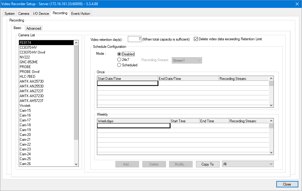 - 要啟用錄影功能, 選擇 24x7 或是 Scheduled;