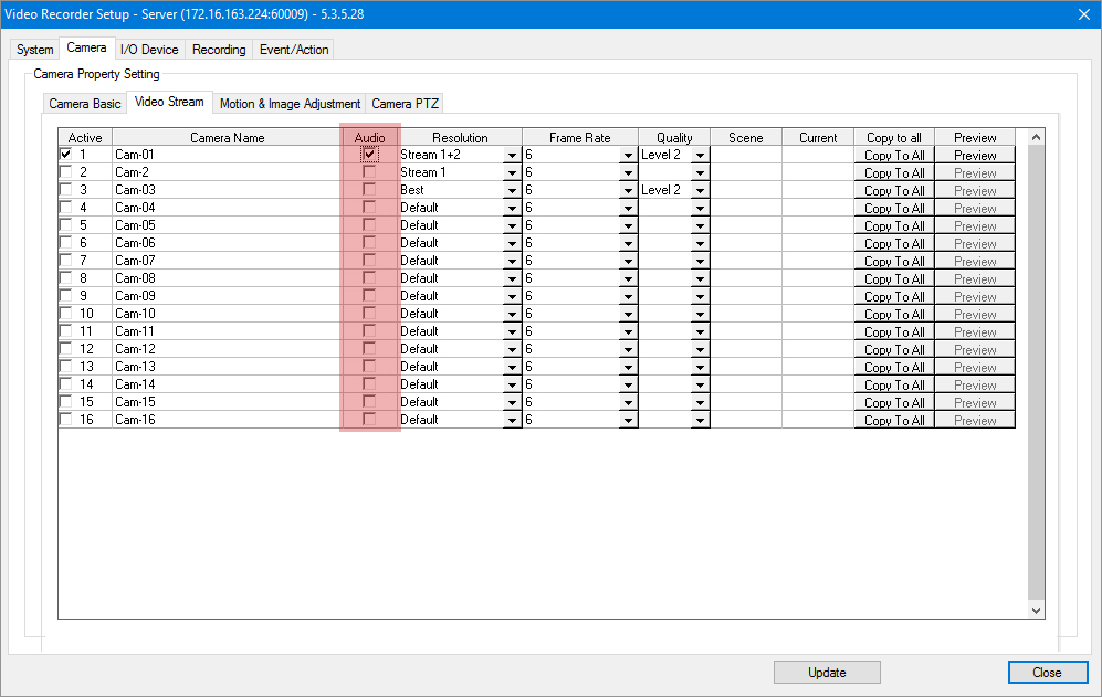 - 首先,透過攝影機的網路控制介面啟用攝影機的音訊功能;